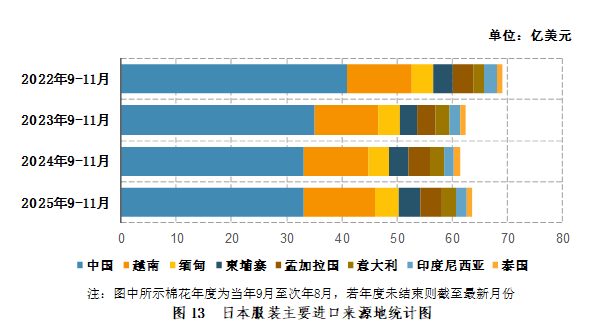 2025年9-11月,日本服装进口主要来源地为:中国(33.2亿美元,占48.5%),越南(12.9亿美元,占18.8%),缅甸(4.4亿美元,占6.5%),柬埔寨(3.9亿美元,占5.7%),孟加拉国(3.8亿美元,占5.5%),意大利(2.7亿美元,占3.9%),印度尼西亚(1.9亿美元,占2.8%),泰国(1亿美元,占1.5%)(图13)。