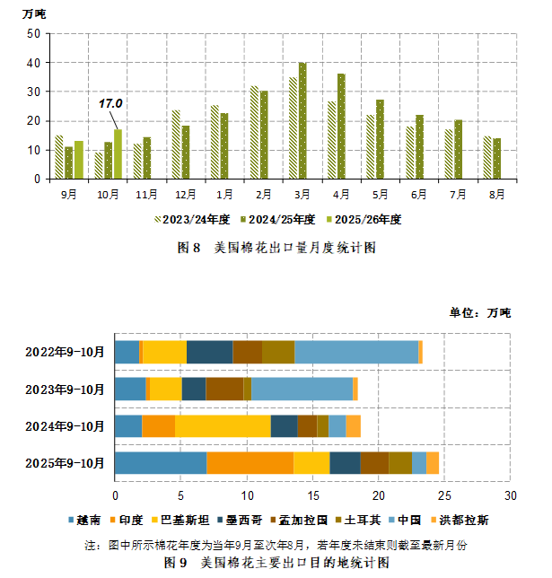 2025年10月,美国棉花出口17.02万吨,同比增长4.5万吨,同比增幅35.4%。2025年9-10月,美国棉花出口29.91万吨,同比增长6.3万吨,同比增幅26.8%(图8)。