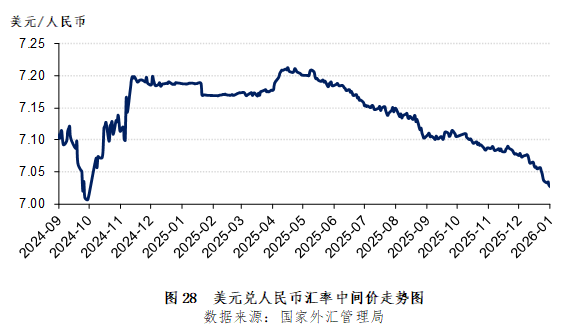 2025年12月,人民币兑美元汇率显著走强,12月31日,美元兑人民币中间价7.0288,环比升值501个基点(图28)。