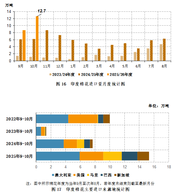 2025年10月,印度棉花进口12.67万吨,同比增长6.5万吨,同比增幅104.7%。2025年9-10月,印度棉花进口21.4万吨,同比增长9.1万吨,同比增幅73.5%(图16)。