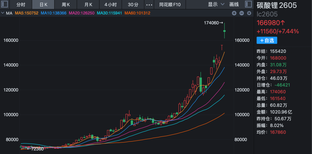 1月13日,国内期货市场碳酸锂主力合约2605持续领涨,盘中一度涨停,突破17万元/吨关口。不过午后该主力合约涨势回落,截至下午收盘,碳酸锂2605合约报涨7.44%,收于166980元/吨。