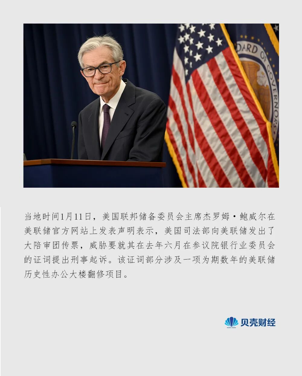 当地时间1月11日,美国联邦储备委员会主席杰罗姆鲍威尔在美联储官方网站上发表声明表示,美国司法部向美联储发出了大陪审团传票,威胁要就其在去年六月在参议院银行业委员会的证词提出刑事起诉。该证词部分涉及一项为期数年的美联储历史性办公大楼翻修项目。
