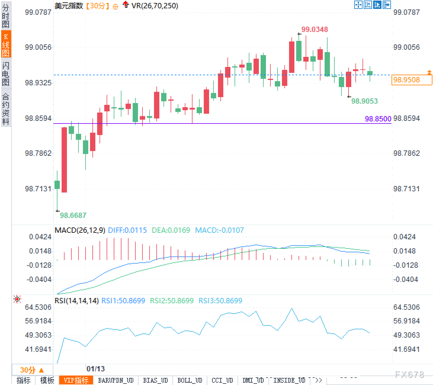 汇通财经APP讯——周二(1月13日),美元指数欧洲时段围绕98.95附近窄幅震荡,走势显得犹豫不决。从技术图形看,价格曾在98.6687一线形成阶段性低点后展开反弹,一度冲高至99.0348,但后续动能明显减弱,未能站稳99关口,随即回落至下方整理。