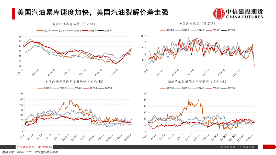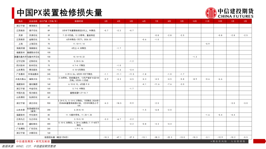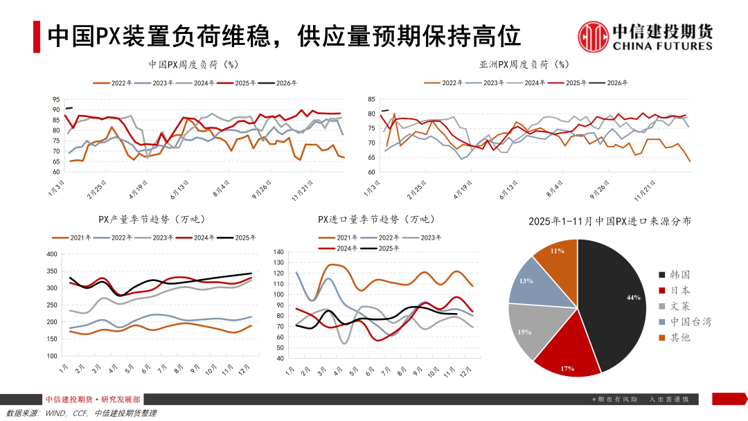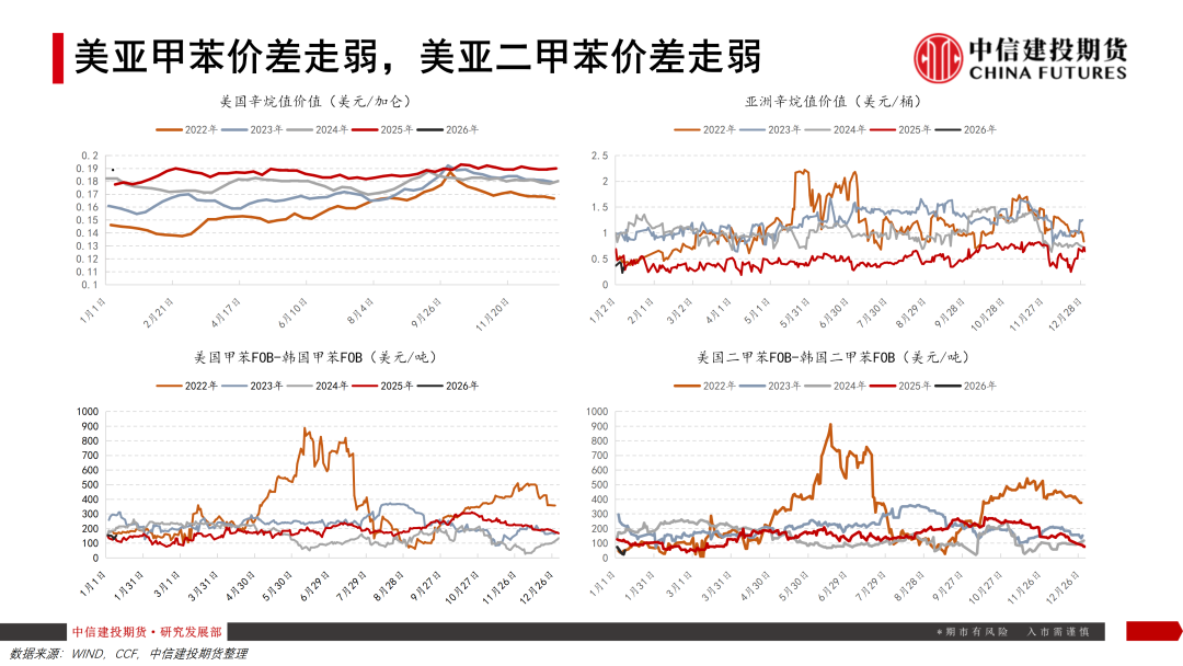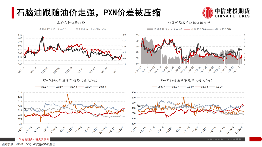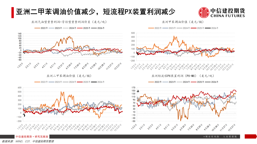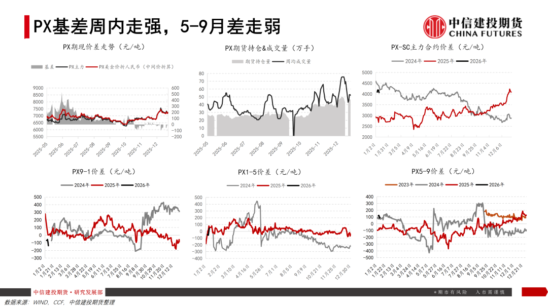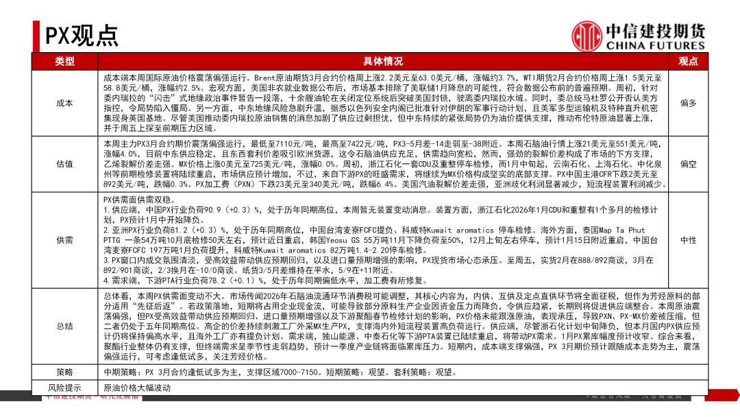 PX:总体看,本周PX供需面变动不大。市场传闻2026年石脑油流通环节消费税可能调整,其核心内容为,内供、互供及定点直供环节将全面征税,但作为芳烃原料的部分适用“先征后返”。若政策落地,短期将占用企业现金流,可能导致部分原料生产企业因资金压力而降负,令供应趋紧,长期则将促进供应端整合。本周原油震荡偏强,但PX受高效益带动供应预期回归、进口量预期增强以及下游聚酯春节检修计划的影响,PX价格未能跟涨原油,表现承压,导致PXN、PX-MX价差被压缩,但二者仍处于五年同期高位。高企的价差持续刺激工厂外采MX生产PX,支撑海内外短流程装置高负荷运行。供应端,尽管浙石化计划中旬降负,但本月国内PX供应预计仍将保持偏高水平,且海外工厂亦有提负计划。需求端,独山能源、中泰石化等下游PTA装置已陆续重启,将带动PX需求。1月PX累库幅度预计收窄。综合来看,聚酯行业整体仍有支撑,但终端需求呈季节性走弱趋势,预计一季度产业链将面临累库压力。短期内,成本端支撑偏强,PX 3月期价预计跟随成本走势为主,震荡偏强运行,可考虑逢低试多,关注芳烃价格。