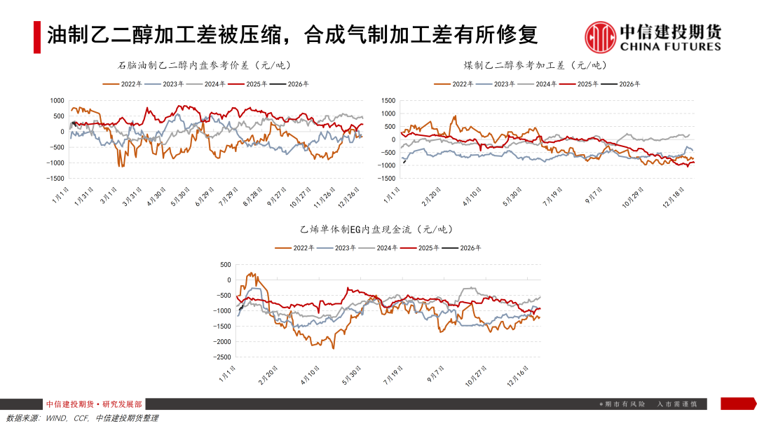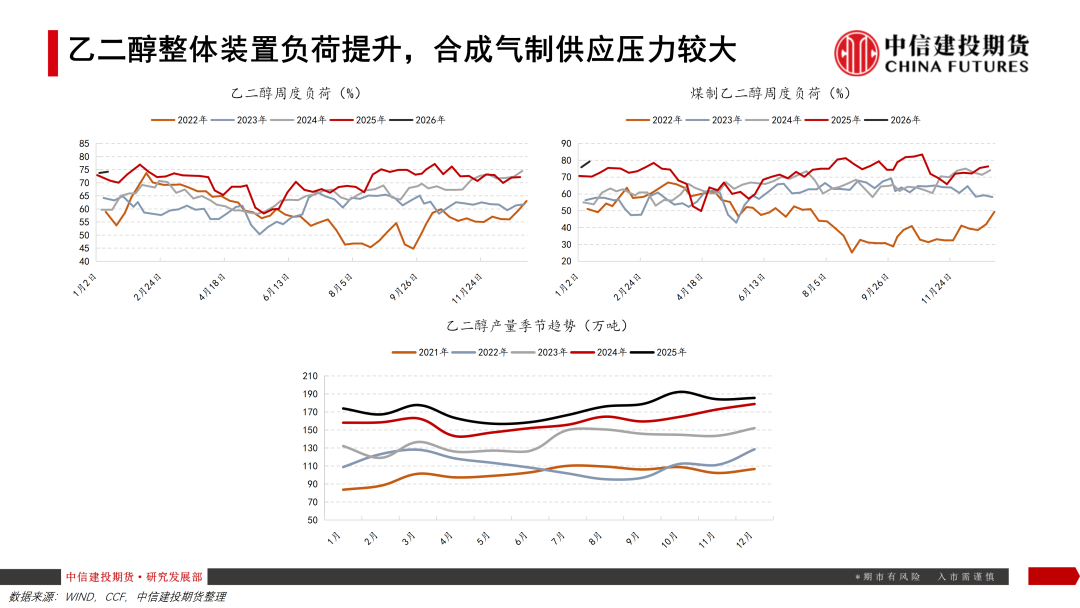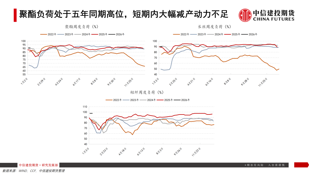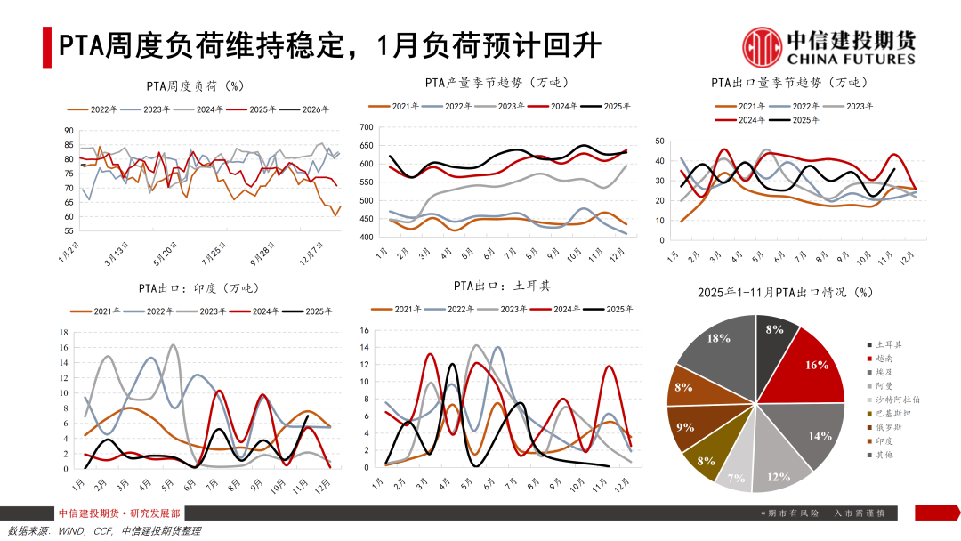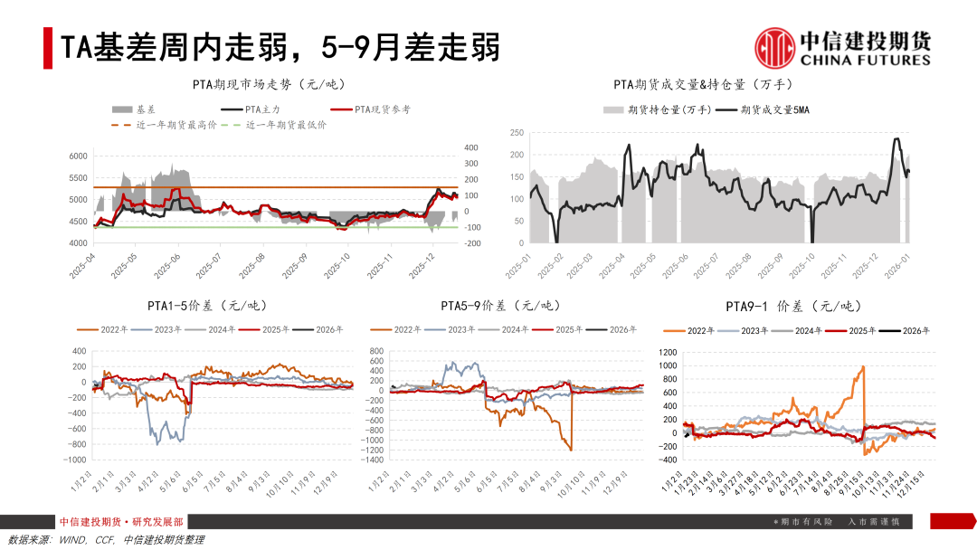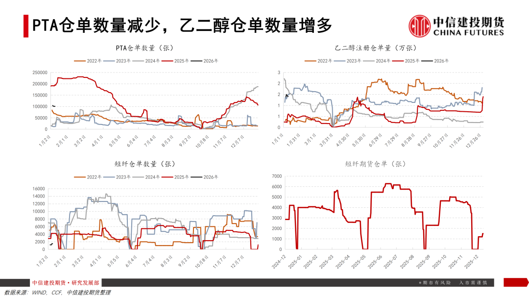 PTA:总体看,本周PTA供需面变动不大。供应端,本周PTA行业开工率稳定在较历史同期偏低的水平。下半周,随着下游聚酯工厂春节检修计划密集公布,市场担忧情绪升温,贸易商出货意愿增强,带动现货基差走弱。然而,较高的PTA检修量叠加BIS认证放开带动的出口增长,仍对基差构成支撑,且仓单延续逆季节性流出。需求端,新订单氛围整体偏弱,虽然汇率波动影响了出口接单积极性,但外贸订单表现仍优于内销。江浙地区终端工厂开工率持续下降,预计自中旬起将陆续提前进入春节假期,并于1月下旬集中放假。目前,内销备货需求尚未有效启动,预计将于1月中旬逐步展开,但补库力度有限,难以扭转整体弱势。聚酯环节,本周负荷持稳于五年同期高位,根据已公布的检修计划,预计自本月下旬起行业开工将加速下滑。不过,检修多以中小企业常规假期安排为主,且因其产能占比相对较少,对总体负荷影响有限,龙头企业尚未出台明确检修计划。与此同时,涤丝产销表现偏弱,长丝库存累积速度放缓,但绝对水平仍处历年同期偏低水平。受终端需求拖累,成本上涨未能顺利向下游传导,聚酯产品现金流因此被压缩。不过,考虑到当前涤丝库存压力不大,若原油持续走强,企业库存存在升值预期,短期内聚酯企业大幅减产的动力依然不足。综合来看,当前TA-聚酯环节基本面尚有支撑,PTA现货基差偏强,但其持续性将受到聚酯减产预期的考验,同时,终端需求走弱也将形成压制,一季度产业链面临累库压力。短期内,TA 5月期价预计跟随成本走势为主,震荡偏强运行,可考虑逢低试多。