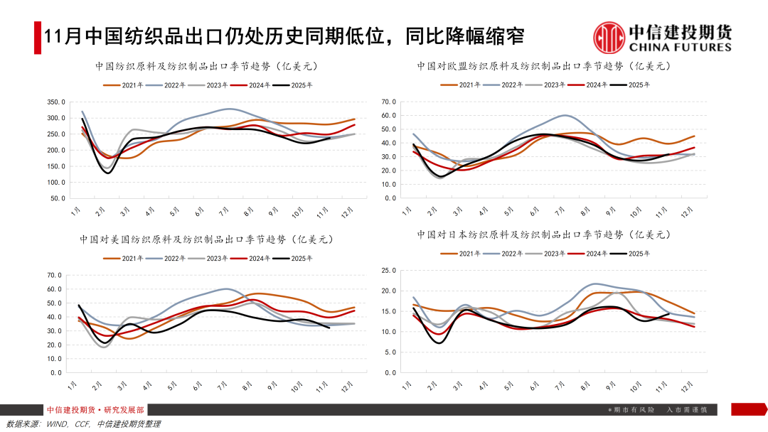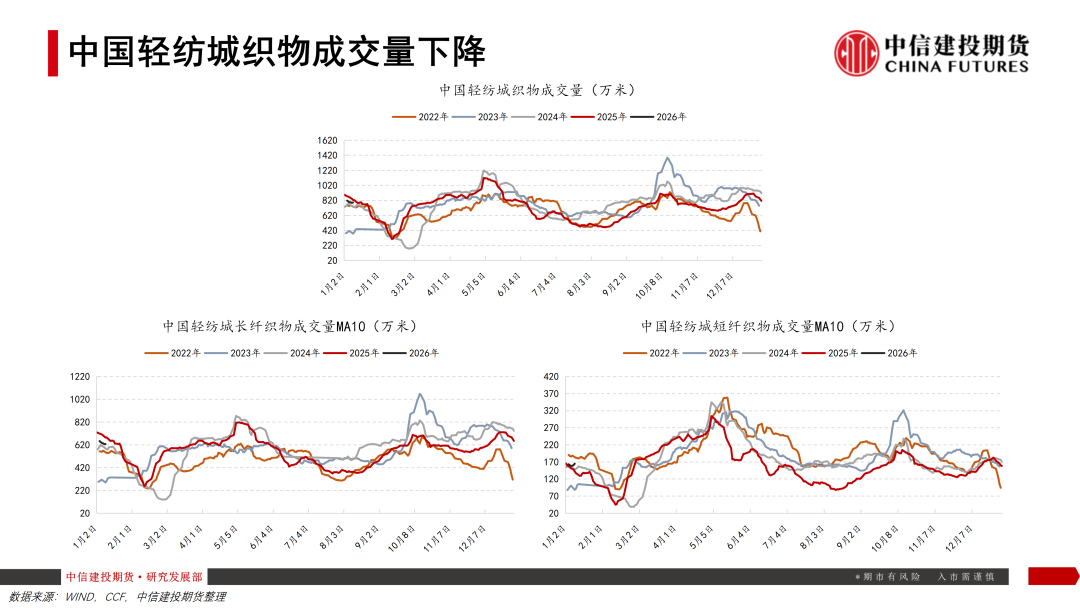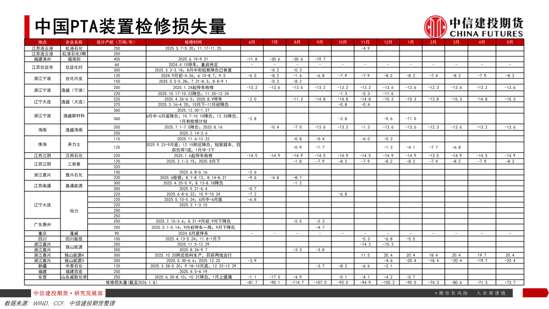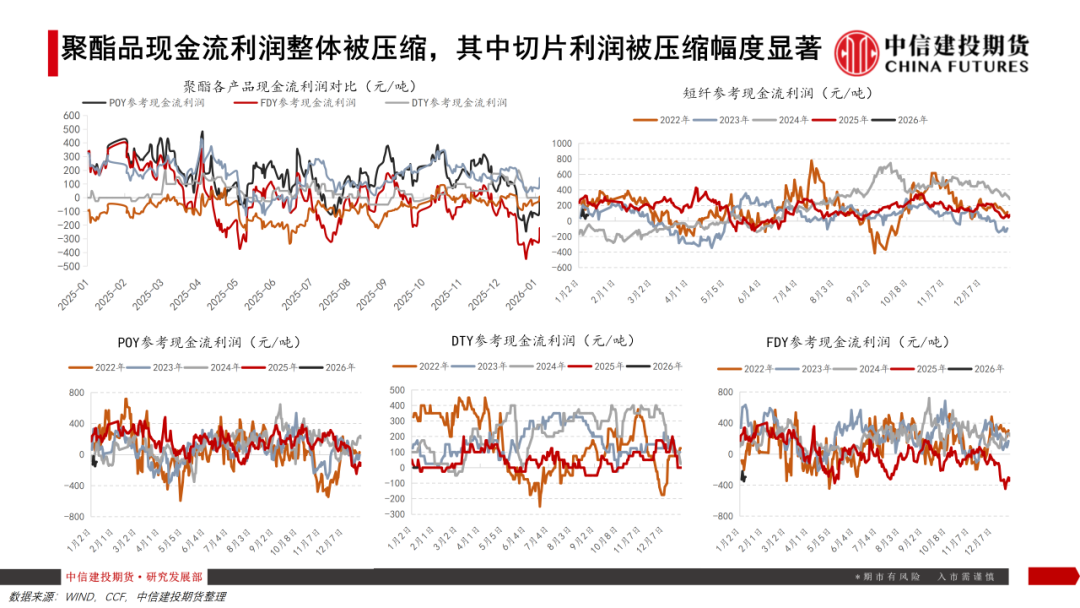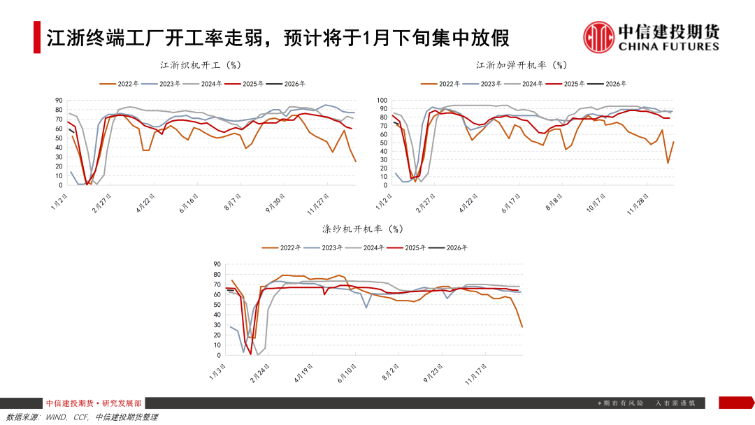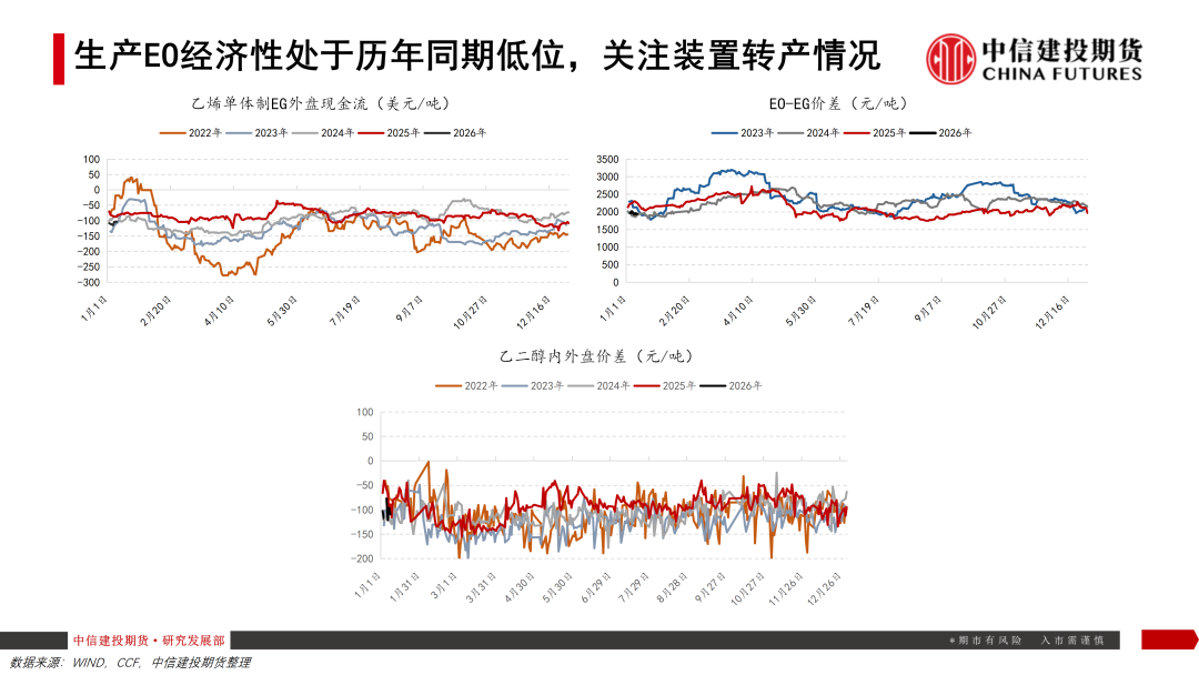 PTA:总体看,本周PTA供需面变动不大。供应端,本周PTA行业开工率稳定在较历史同期偏低的水平。下半周,随着下游聚酯工厂春节检修计划密集公布,市场担忧情绪升温,贸易商出货意愿增强,带动现货基差走弱。然而,较高的PTA检修量叠加BIS认证放开带动的出口增长,仍对基差构成支撑,且仓单延续逆季节性流出。需求端,新订单氛围整体偏弱,虽然汇率波动影响了出口接单积极性,但外贸订单表现仍优于内销。江浙地区终端工厂开工率持续下降,预计自中旬起将陆续提前进入春节假期,并于1月下旬集中放假。目前,内销备货需求尚未有效启动,预计将于1月中旬逐步展开,但补库力度有限,难以扭转整体弱势。聚酯环节,本周负荷持稳于五年同期高位,根据已公布的检修计划,预计自本月下旬起行业开工将加速下滑。不过,检修多以中小企业常规假期安排为主,且因其产能占比相对较少,对总体负荷影响有限,龙头企业尚未出台明确检修计划。与此同时,涤丝产销表现偏弱,长丝库存累积速度放缓,但绝对水平仍处历年同期偏低水平。受终端需求拖累,成本上涨未能顺利向下游传导,聚酯产品现金流因此被压缩。不过,考虑到当前涤丝库存压力不大,若原油持续走强,企业库存存在升值预期,短期内聚酯企业大幅减产的动力依然不足。综合来看,当前TA-聚酯环节基本面尚有支撑,PTA现货基差偏强,但其持续性将受到聚酯减产预期的考验,同时,终端需求走弱也将形成压制,一季度产业链面临累库压力。短期内,TA 5月期价预计跟随成本走势为主,震荡偏强运行,可考虑逢低试多。