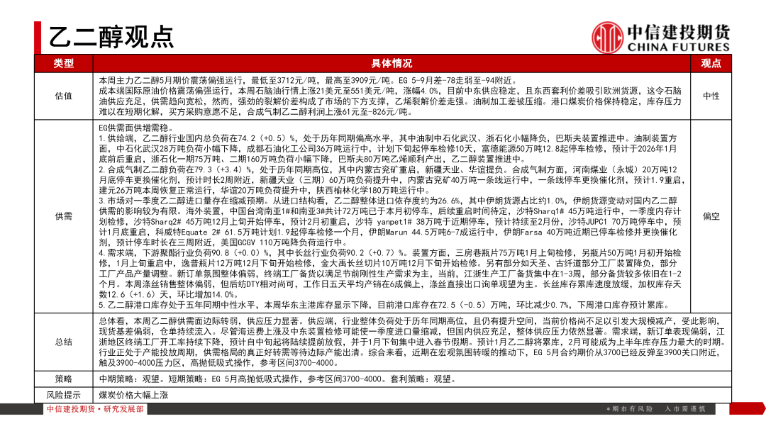 乙二醇:总体看,本周乙二醇供需面边际转弱,供应压力显著。供应端,行业整体负荷处于历年同期高位,且仍有提升空间,当前价格尚不足以引发大规模减产,受此影响,现货基差偏弱,仓单持续流入。尽管海运费上涨及中东装置检修可能使一季度进口量缩减,但国内供应充足,整体供应压力依然显著。需求端,新订单表现偏弱,江浙地区终端工厂开工率持续下降,预计自中旬起将陆续提前放假,并于1月下旬集中进入春节假期。预计1月乙二醇将累库,2月可能成为上半年库存压力最大的时期。行业正处于产能投放周期,供需格局的真正好转需等待边际产能出清。综合来看,近期在宏观氛围转暖的推动下,EG 5月合约期价从3700已经反弹至3900关口附近,触及3900-4000压力区,高抛低吸式操作,参考区间3700-4000。