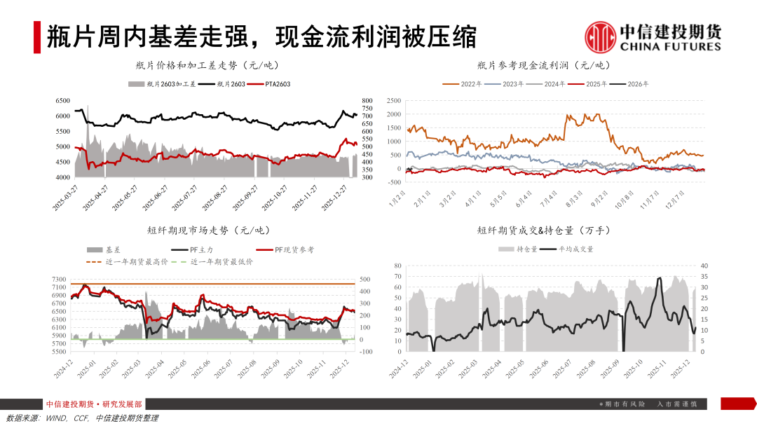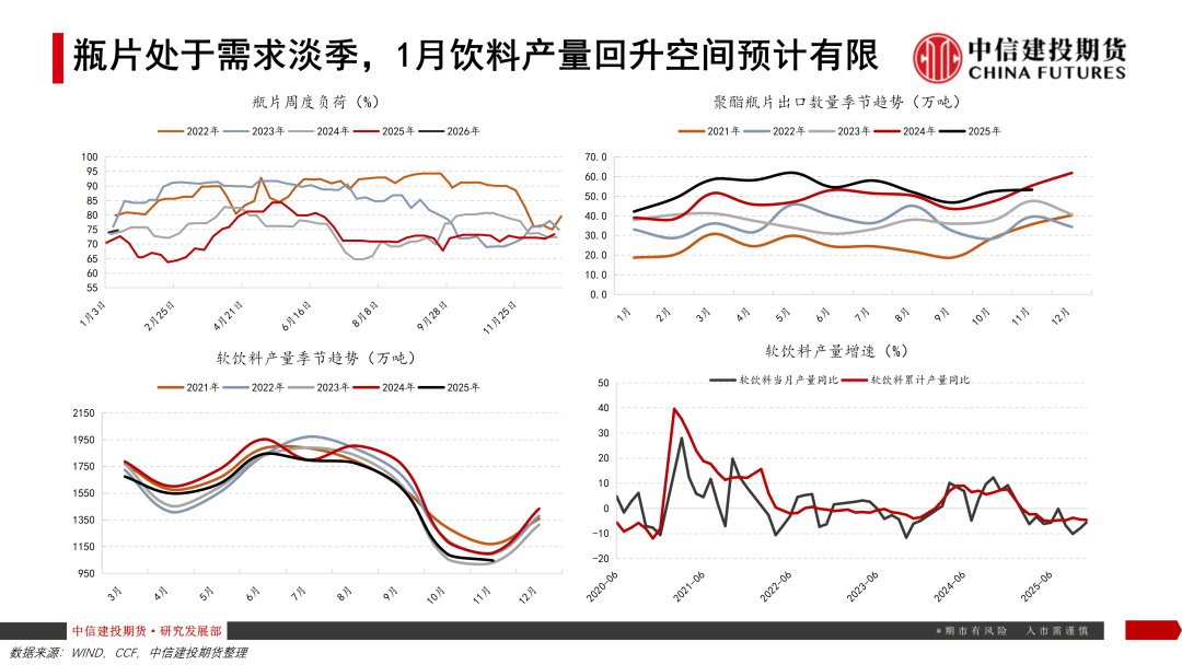 瓶片:总体看,瓶片基本面维持弱势。受终端需求拖累,当前加工费有所回落,但仍维持在年内偏高水平,这主要得益于前期行业约20%的减停产计划有效缓解了供应压力,此外,由于部分工厂后续存春节检修计划,加工费下方空间预计有限。供应端,随着三房巷重启,行业开工负荷已有所提升,但总体开工仍处于历年同期低位,目前已公布的后续减停计划较少。需求端,当前处于饮料消费传统淡季,预计1月产量回升空间有限。受此影响,下游刚需采购乏力且囤货意愿低迷,持续压制市场情绪。短期内,终端需求疲软的局面难以快速扭转,瓶片仍是聚酯产业链中基本面最弱环节,但成本端支撑偏强,PR 3月期价预计将跟随原料价格震荡偏强运行。