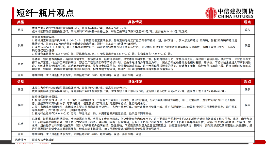 短纤:总体看,短纤基本面偏弱。当前终端需求处于季节性淡季,新增订单有限,尽管本周原料价格上涨,但短纤跟涨乏力,价格传导受阻,导致加工差被压缩。供应方面,企业低库存支撑了生产意愿,行业开工率维持高位,部分工厂已陆续公布春节检修计划,但由于短纤自身库存压力不大,因此公布的检修计划也相对有限。需求端,下游纱线企业进入节前收尾阶段,在制定放假计划的同时,采购态度趋于谨慎,叠加资金回笼压力,企业普遍加速回款,进一步显现需求淡季的特征。预计自下旬起,涤纱负荷将加速下滑,进而抑制对短纤的采购需求。短期内,终端需求偏弱将继续压制价格,但成本端支撑偏强,预计PF 3月期价将跟随原料价格震荡偏强运行。