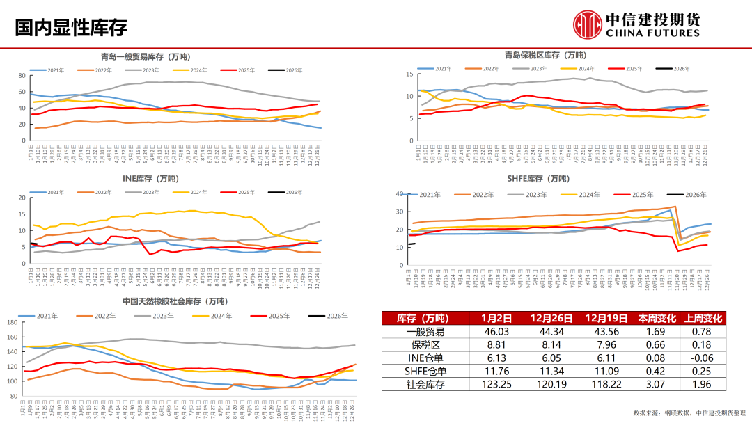 库存:截至2026年1月4日,中国天然橡胶社会库存123.2万吨,环比增加3.1万吨,增幅2.5%。中国深色胶社会总库存为81.5万吨,增3%。其中青岛现货库存增4.5%;云南增0.3%;越南10#增3.5%;NR库存小计增1.3%。中国浅色胶社会总库存为41.7万吨,环比增1.3%。其中老全乳胶环比降0.8%,3L环比增7%,RU库存小计增3.6%。