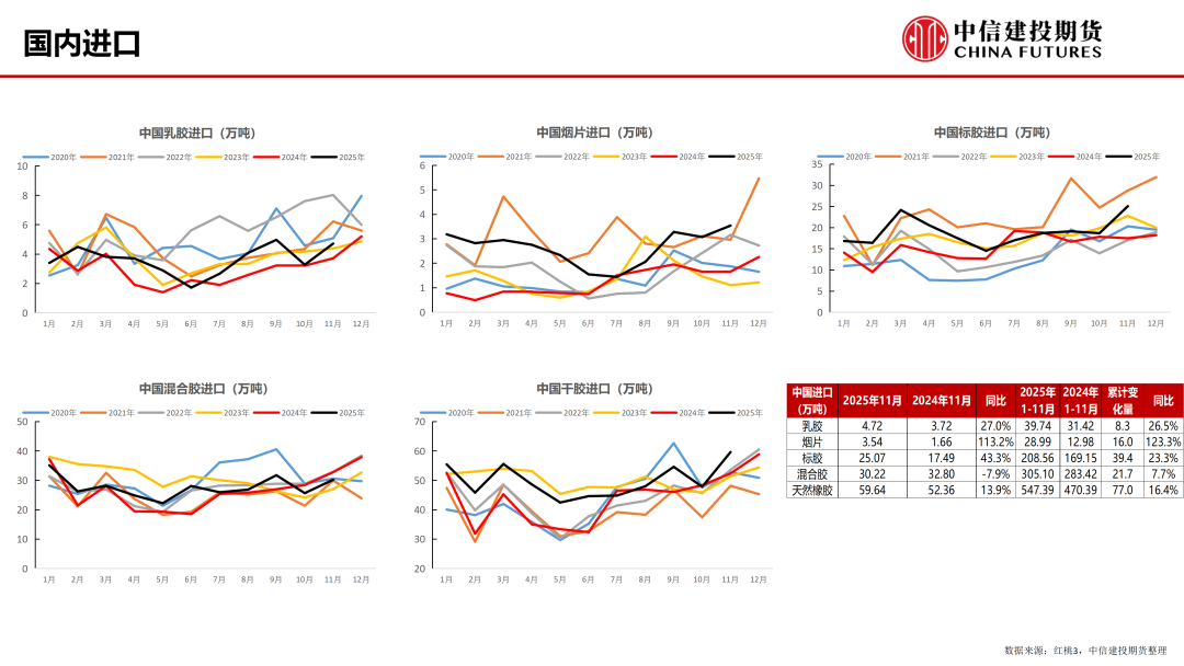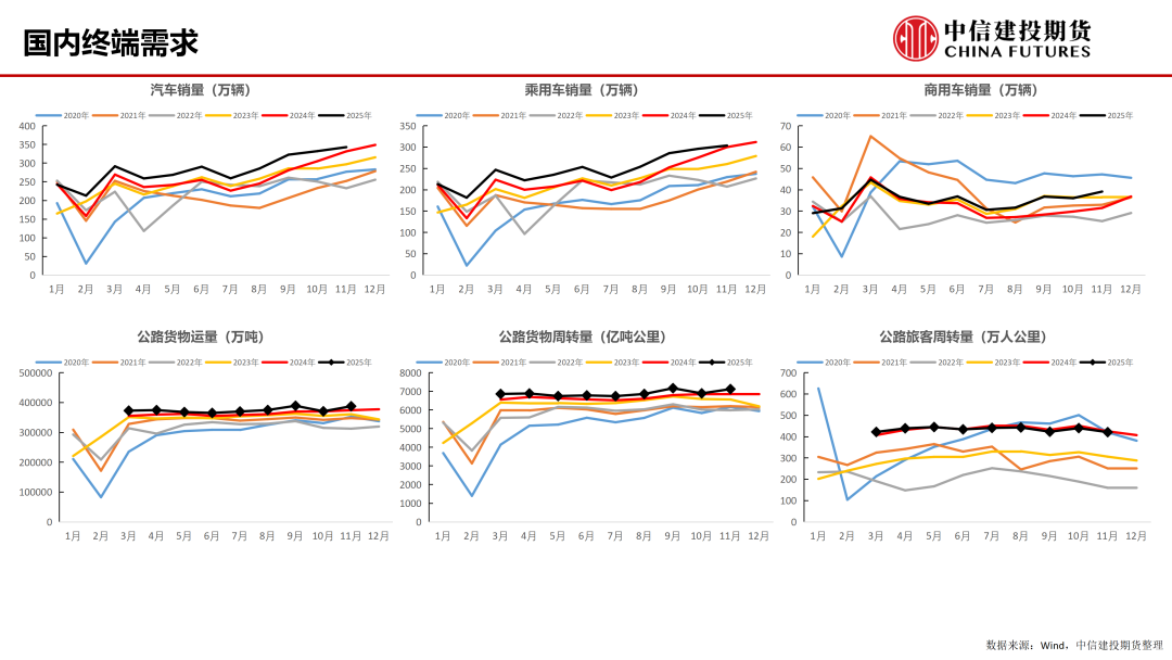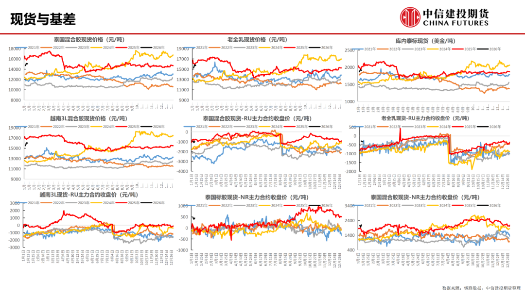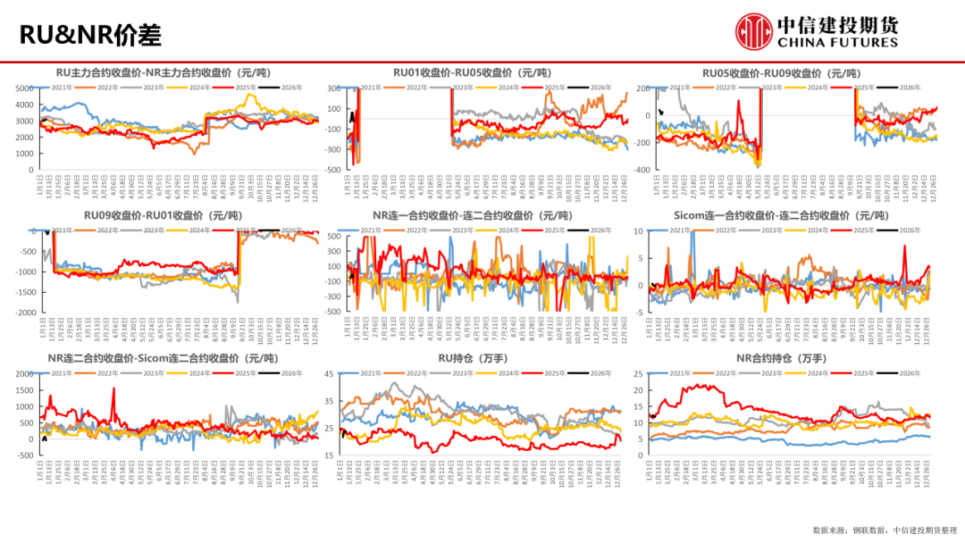 逻辑:随着北半球冬季来临,全球即将进入低产季,也代表着单边价格的定价框架将从供需平衡的动态定价转换至存量库存的静态定价,在近期商品市场预期全面走强的背景下,预计短期内RU&NR&Sicom仍将高位震荡。向后看,尽管认为2026全球轮胎等橡胶制品的需求将迎来温和增长,但是需求的增长是需要时间的,以及全球贸易壁垒仍未完全消除,需求增长的量级或仍然受限。因此,预计在2026年农历春节之前,本轮反弹行情的高度或不高于2025年7月底。