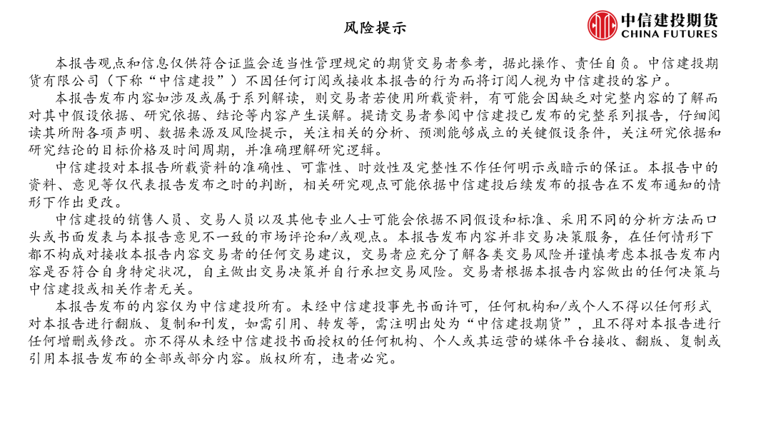 本报告发布的内容仅为中信建投所有。未经中信建投事先书面许可,任何机构和/或个人不得以任何形式对本报告进行翻版、复制和刊发,如需引用、转发等,需注明出处为“中信建投期货”,且不得对本报告进行任何增删或修改。亦不得从未经中信建投书面授权的任何机构、个人或其运营的媒体平台接收、翻版、复制或引用本报告发布的全部或部分内容。版权所有,违者必究。