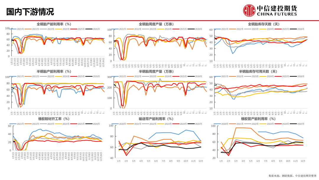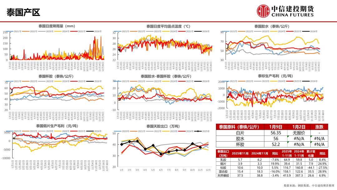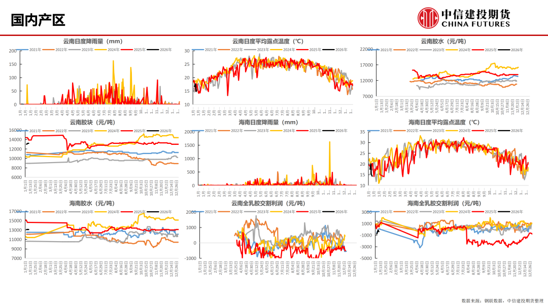 上游:本周,泰国整体天气趋于正常,泰国工厂原料库存基本维持1-2个月,多则有3个月附近,工厂原料储备不及去年同期。截至1月9日,泰国胶水报收52.2泰铢/公斤,泰国杯胶报收56.0泰铢/公斤,水杯价差低位震荡;印尼南部巨港(赤道南),部分胶树仍处于落叶期,北部棉兰(赤道北)逐步进入旺产季;科特迪瓦即将进入低产季;本周越南产区天气整体良好,产区割胶作业未受到扰动,原料供应稳定在常规状态;本周云南产区停割;本周海南产区随着气温逐渐下滑,停割面积进一步扩大,仅剩余西线零星胶园、南部少数地区仍有割胶,全岛可收胶量较为稀少,原料收购价格波动有限,至此海南天然橡胶割胶季进入尾声。