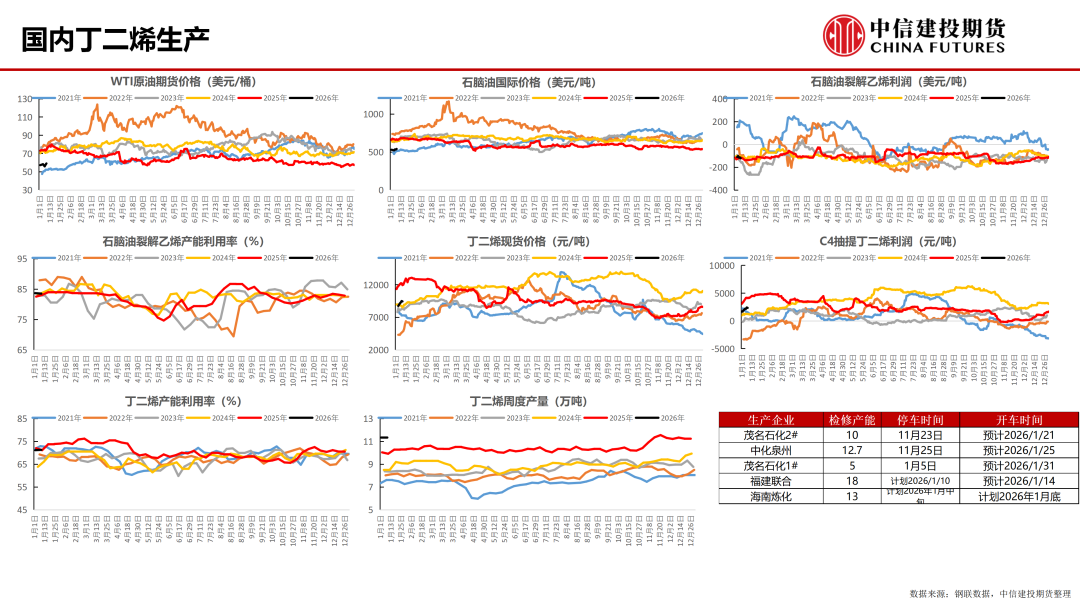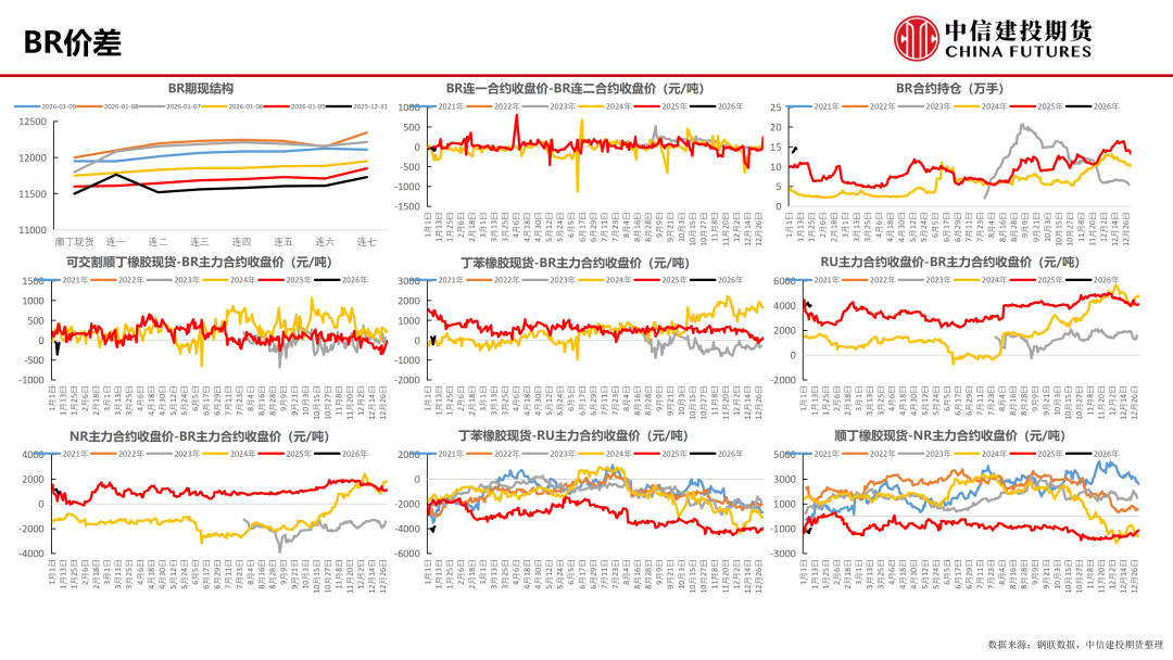 期货:本周,现货贴水BR2602合约65元/吨,近期结构切换为Contango。本周BR仓单为4530吨,环比上周减少30吨。本周BR全合约持仓约为14.5万手,持仓回暖。
