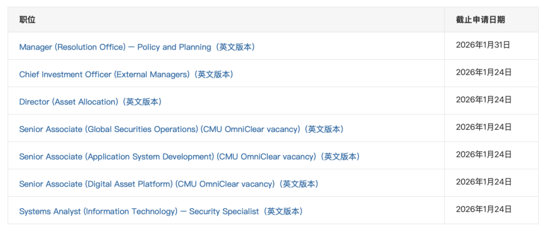 官网信息显示,日前,香港金融管理局(以下简称香港金管局)正在招聘包括首席投资官(外部管理人)在内的7个职位。2025年10月从摩根大通吸纳一位助理总裁后,香港金管局拟再次开放招募人才担任重磅职位。其中,首席投资官(外部管理人)职位申请的截止日期为2026年1月24日。