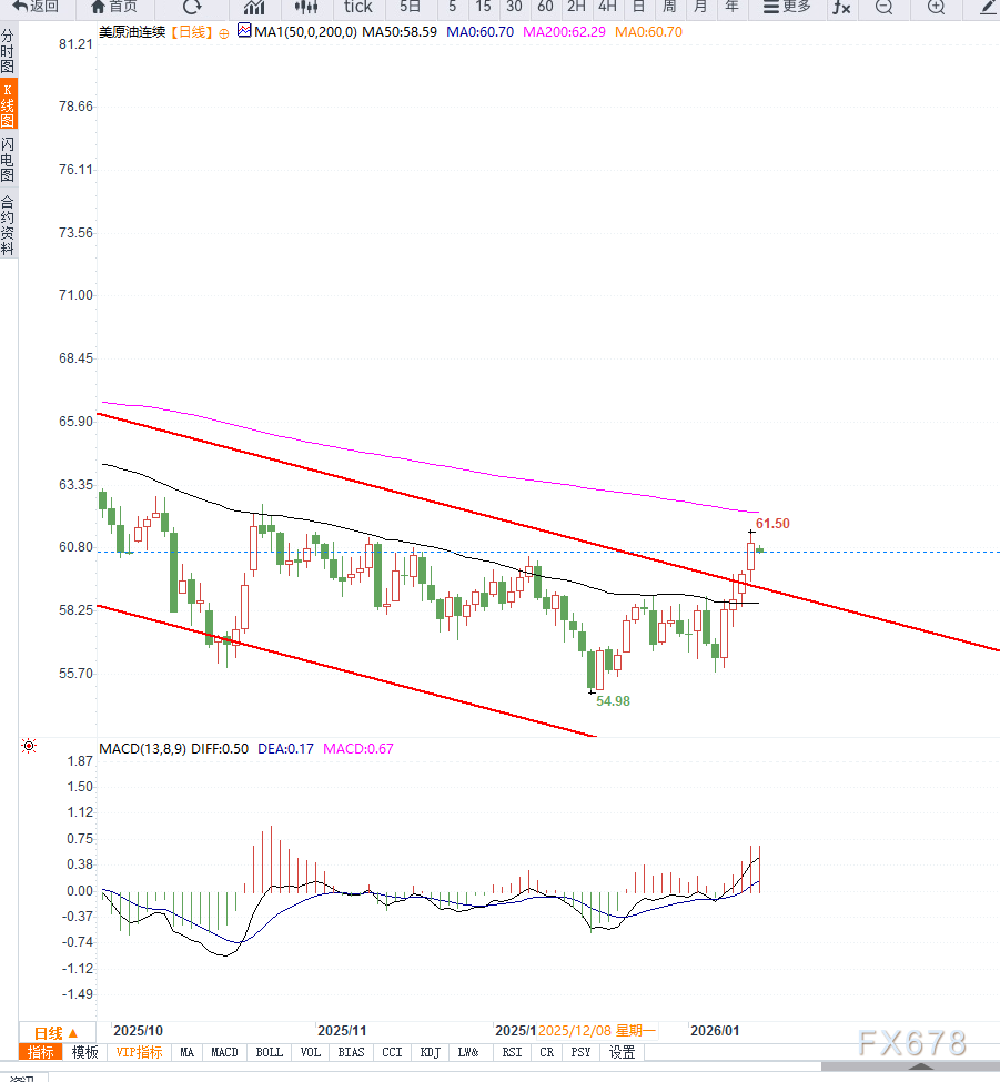 若RSI继续向70靠拢,短线追高风险将明显上升。从阻力位来看,61.50—62.00美元区间为近两个月高点密集区域,也是前期下跌趋势中的关键反压位,若无法有效突破,油价可能再度回落至区间整理。