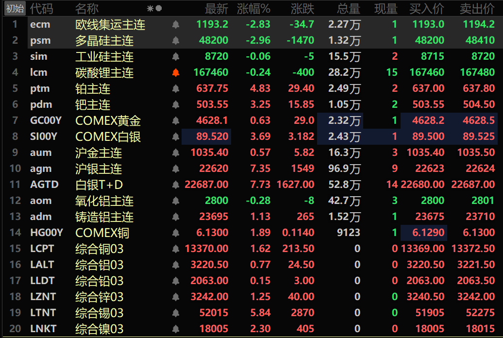 此外,铸造铝主连期货涨1.13%,氧化铝主连跌0.28%。碳酸锂主连跌0.24%。工业硅主连跌0.06%。多晶硅主连跌2.96%。