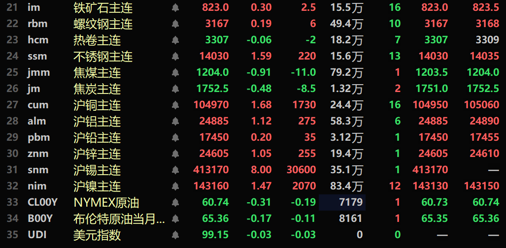 截至午间收盘,内盘基本金属普涨,沪铜涨1.68%,盘中刷新历史新高至105650元/吨。沪铝涨1.12%。沪铅涨0.2%,沪锌涨1.05%。沪锡以8%的涨幅涨停,盘中刷新历史新高至413170元/吨。沪镍涨1.47%。