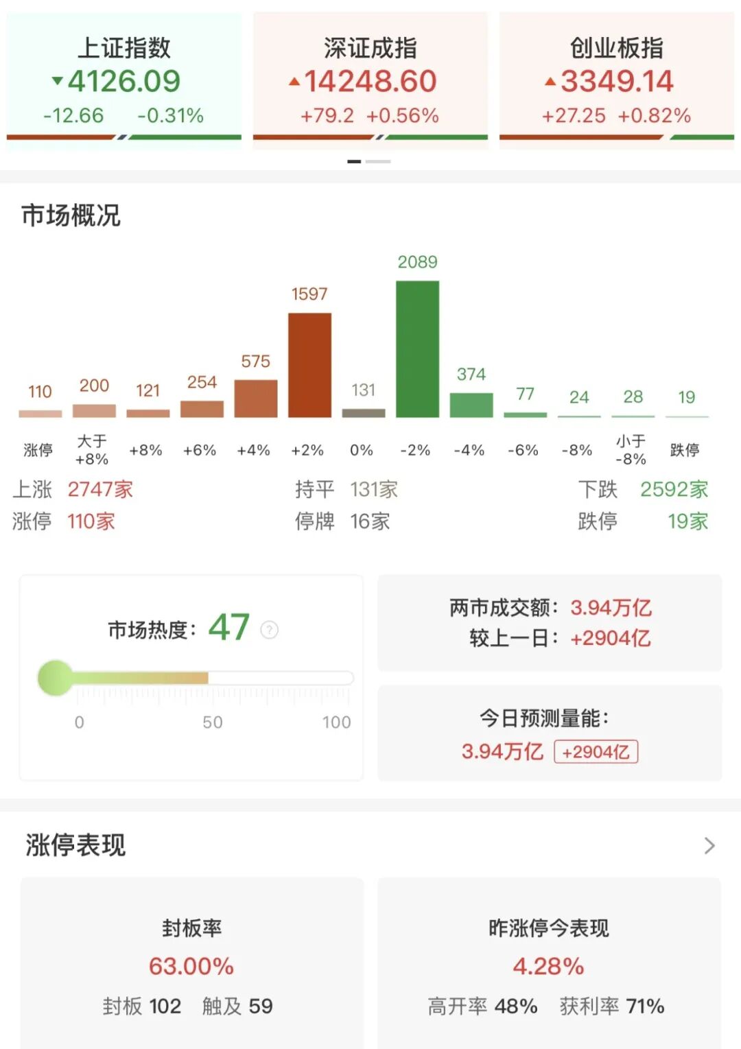 沪深两市成交额3.94万亿!沪指冲高回落跌0.31%