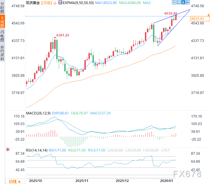 上行方面,近期阻力位见于4640美元,该位置与上升楔形上轨边界重合。若突破这一多重阻力位,金价可能进一步上探4660美元水平。