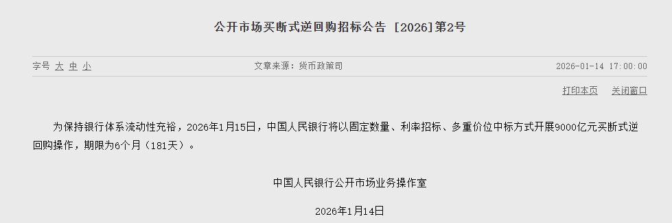 【大河财立方消息】1月14日,央行公告称,为保持银行体系流动性充裕,2026年1月15日,中国人民银行将以固定数量、利率招标、多重价位中标方式开展9000亿元买断式逆回购操作,期限为6个月(181天)。