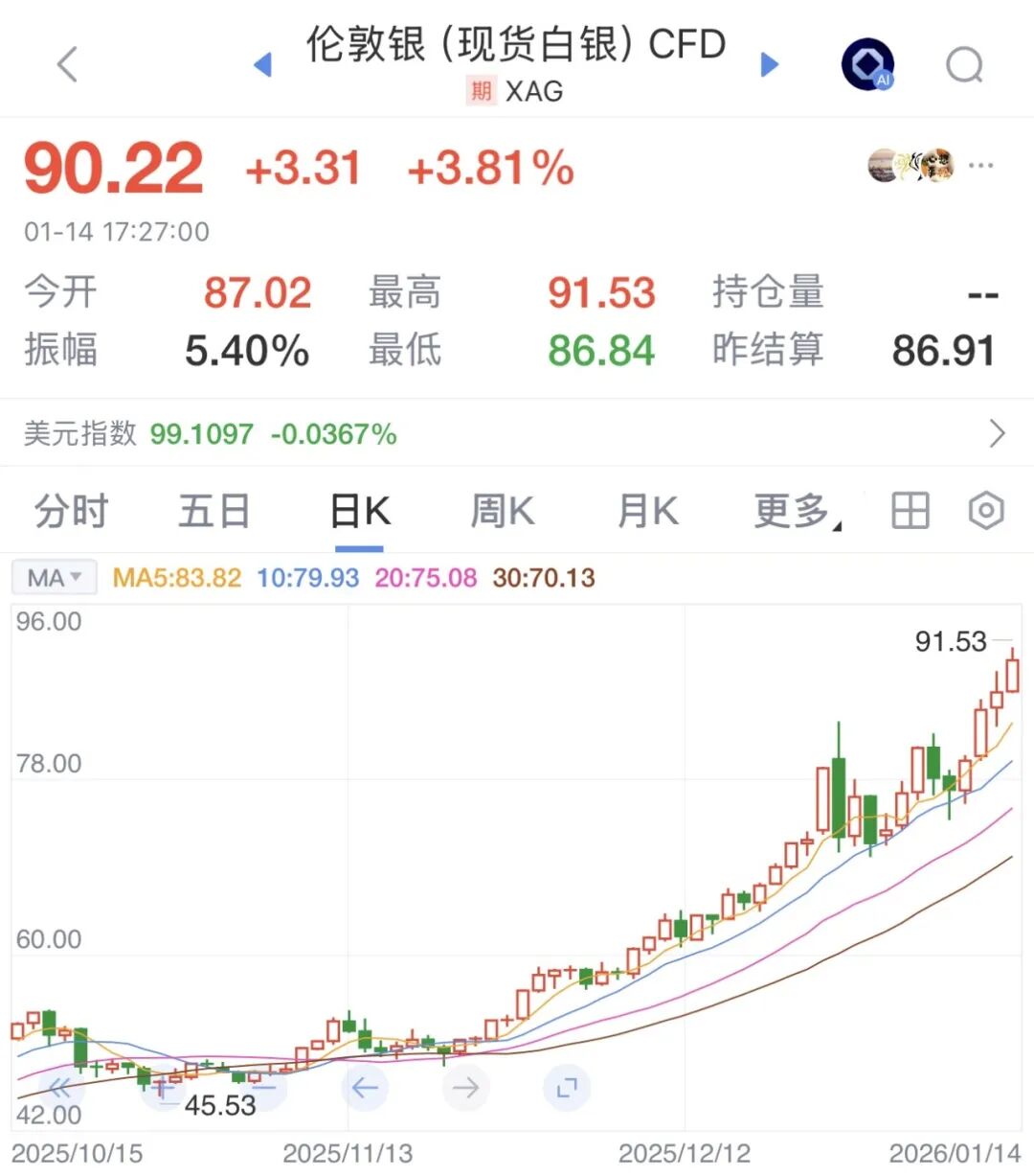 花旗银行坚持国际银价表现将优于国际金价的观点,但未来基本金属可能将抢走风头。现货市场目前仍供应紧张,尤其是白银和铂族金属。2026年1月14日盘中,伦敦银价格创下91美元/盎司的历史新高。