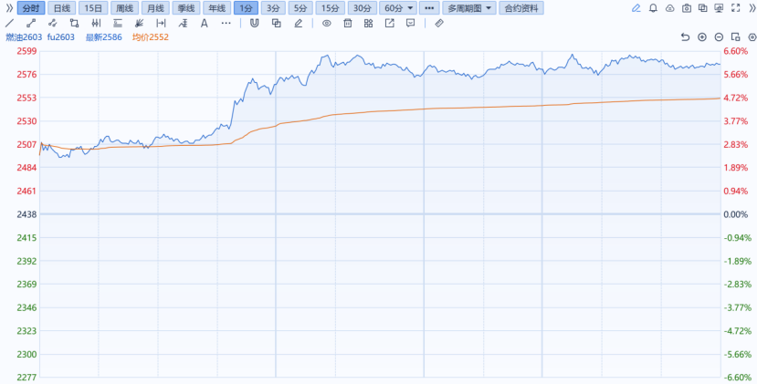 2026年1月14日,SHFE燃油主力合约(FU.SHF)开盘价2,496元/吨,最高价2,599元/吨,最低价2,492元/吨,收盘价2,586元/吨,较前一交易日大幅上涨6.07%。