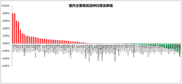 截至2026年1月14日15:00收盘,国内期货主力合约涨跌不一。沪锡涨8%,沪银涨超8%,燃料油涨超6%,铂涨超3%,低硫燃料油(LU)、纯苯涨超2%;跌幅方面,碳酸锂跌超3%,烧碱跌超2%,玻璃、多晶硅、焦煤、菜粕跌超1%。