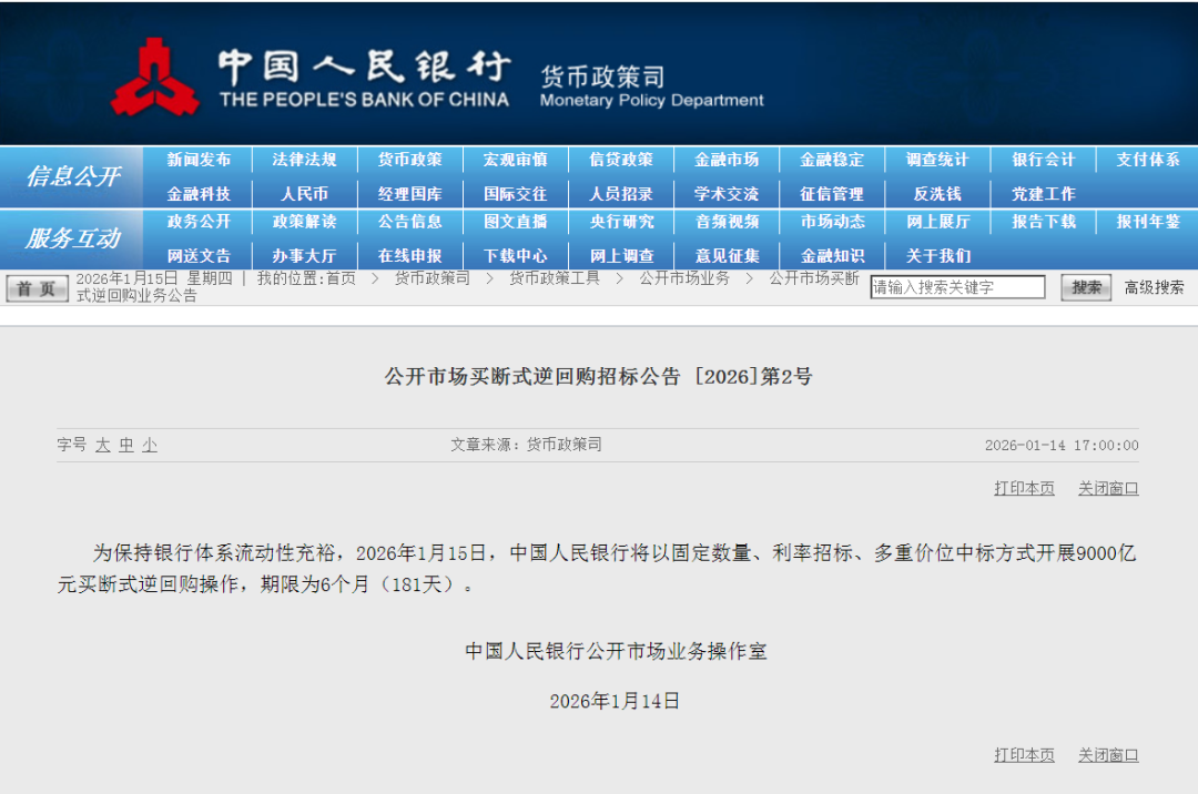 1月14日,央行发布公告称,为保持银行体系流动性充裕,2026年1月15日,央行以固定数量、利率招标、多重价位中标方式开展9000亿元买断式逆回购操作,期限为6个月(181天)。