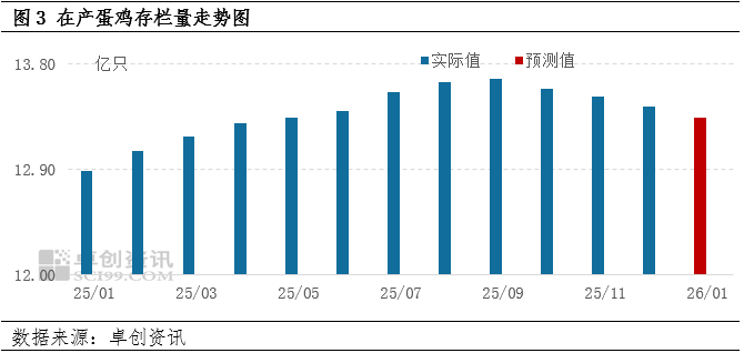 产能去化持续,鸡蛋供应压力有效缓解。2025年蛋鸡养殖行业整体呈现多数时间亏损的运行态势,尤其是下半年行情显著低于市场预期。受此影响,养殖企业补栏积极性由前期较强状态逐步转弱,同时出栏老母鸡意愿明显增强。从新开产蛋鸡数量与老母鸡出栏量的动态变化来看,2025年10月份以来,在产蛋鸡存栏量呈现持续减少趋势。据卓创资讯监测,预计2026年1月份在产蛋鸡存栏量将降至13.34亿只,较2025年9月的存栏高峰期减少3400万只。存栏量的持续下滑,有效缓解了鸡蛋市场的供应压力。