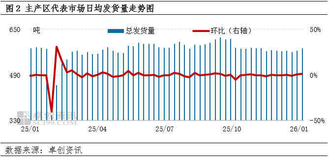 需求增量是蛋价走高的核心驱动。随着春节临近,食品企业为春节备货,鸡蛋采购量增加。春节前蛋价易涨难跌,下游贸易商参市积极性提升,鸡蛋采购量增加。据卓创资讯监测,1月份第1周主产区代表市场日均发货量为582.68吨,环比增幅1.49%。