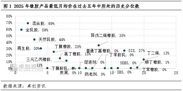 2025年橡胶产品价格重心普遍下移,与2024年强势上涨的行情对比明显。卓创资讯监测数据显示,除天然橡胶相对抗跌,价格处在近五年中等偏上水平外,其他产品均回落到了近五年低位水平,甚至部分产品跌至近五年最低价。年内屡创近五年价格新低的产品有丁二烯及下游丁苯、顺丁、SBS、丁腈胶乳、丁苯胶乳,以及炭黑、促进剂、防老剂。图1中所示,产品所对应的百分数(历史分位数)越小,代表该产品2025年最低月均价在近五年(2021-2025年)月均价中所处的位置越低;如对应历史分位数为0%,代表2025年最低月均价已跌至近五年最低位。