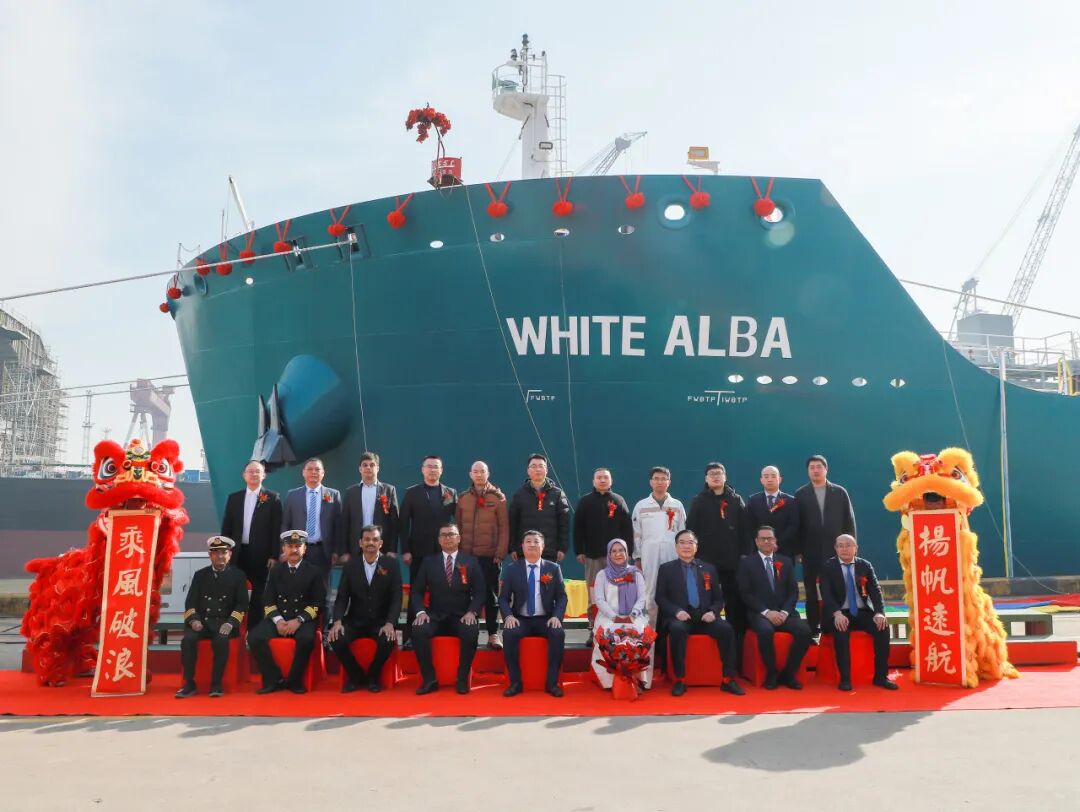 仪式上,命名人赫兹莉娜女士为新船命名剪彩,祝愿“White Alba”轮乘风破浪、扬帆远航。