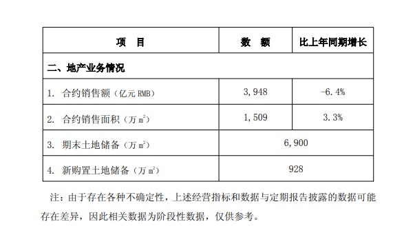 从地区分部来看,境内新签合同额为39,253亿元人民币,比上年同期增长1.4%;境外为2,257亿元人民币,比上年同期增长6.9%。此外,建筑业务的实物量指标中,房屋建筑施工面积为165,442万㎡,比上年同期下降2.3%;房屋建筑新开工面积为27,652万㎡,比上年同期下降10.3%;房屋建筑竣工面积为22,893万㎡,比上年同期增长2.2%。在地产业务情况方面,合约销售额为3,948亿元人民币,比上年同期下降6.4%;合约销售面积为1,509万㎡,比上年同期增长3.3%;期末土地储备为6,900万㎡;新购置土地储备为928万㎡。