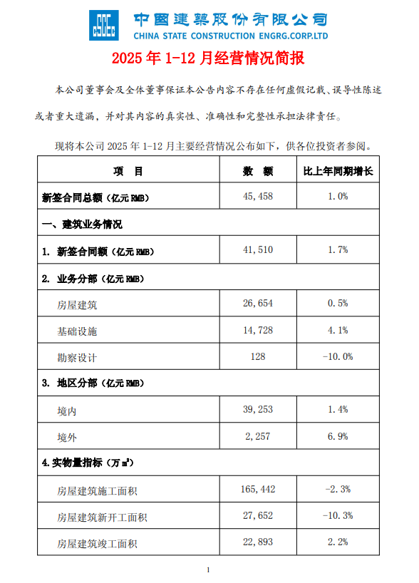 中国建筑2025年新签合同45458亿元人民币同比增长1.0%