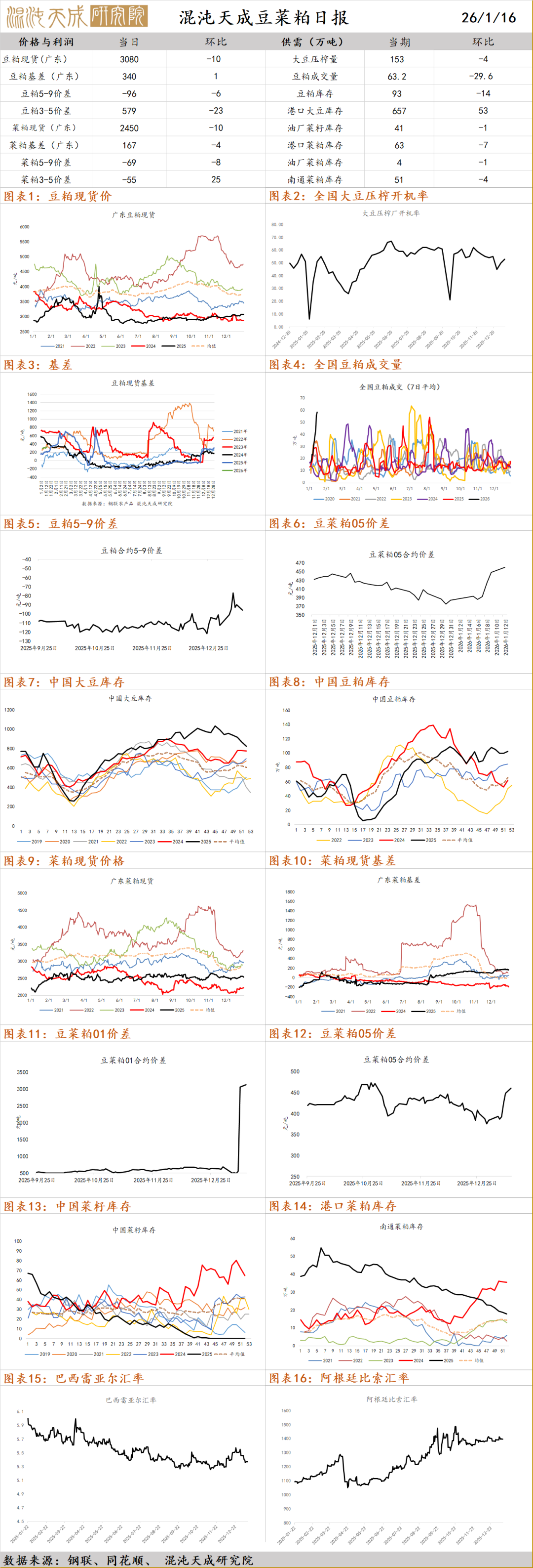 观点汇总:近期豆粕维持震荡行情,菜系整体转弱,两者主要逻辑分化:豆系方面,近期现货供应压力缓解,基差走强,受节后补库需求及春节前备货行情预期的提振,豆粕供需双强下需求增量可能更甚,短期或维持偏强运行。菜粕方面,加拿大访华增加贸易冲突缓和预期,菜系方面整体跟随消息面利空下跌,后续可能偏弱运行。