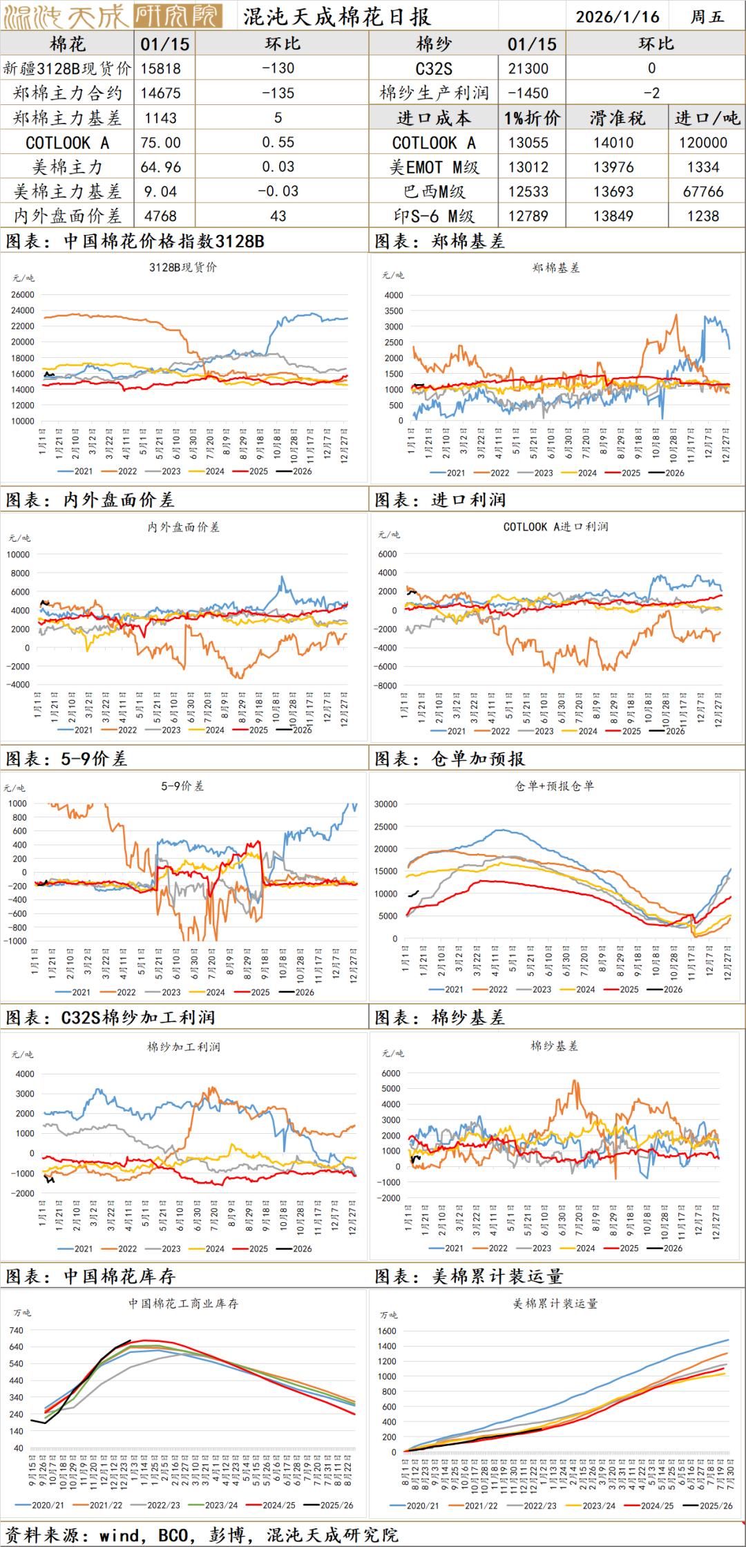 价格:1月15日,国内新疆棉3128B现货价格为15818元/吨,较昨日跌130元/吨;郑棉主连收于14675元/吨,跌135元/吨,跌幅0.91%;期现基差为1143元/吨,较昨日增加5元/吨。