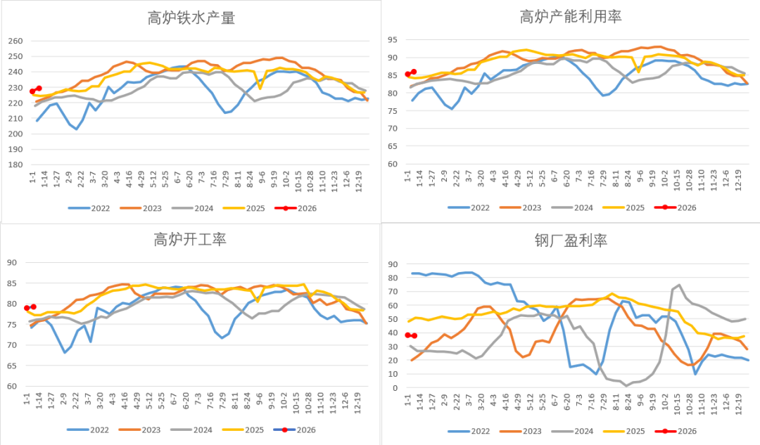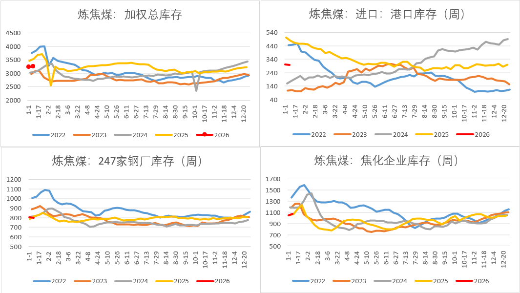 从需求端来看,在去年12月经历钢厂集中检修后,当前铁水产量或已见阶段性低点,受限于下游钢材需求较弱和钢材冬储压力,铁水复产速度预计偏慢,一定程度上拖累焦煤的需求,但钢厂今年还有原料冬储补库的动作,后续关注补库进展,但目前钢厂原料库存相对处于中性位置,剩余冬储的补库空间也较为有限,预计很难形成共振上涨的行情。