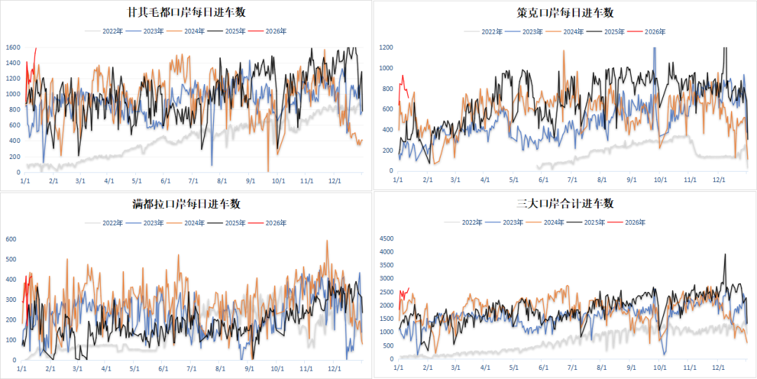 进口煤方面,蒙煤通关量持续拉升,甘其毛都口岸2025 年 12 月日均通关 1431 车(折合 19.11 万吨),同比 + 130%;2026 年元旦后回落至日均 1204 车,本周通关重回每日1500车以上,为近 3 年同期最高水平,口岸库存380多万吨。