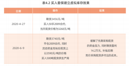 某聚酯企业认为MEG价格相对较低,同时自身原料库存也比较低,想在原料价格低位的时候合理的囤一部分原料,但当时由于公司资金周转问题,可用现金流较少,于是选择在期货上进行买入保值,建立虚拟库存,操作及结果如下: