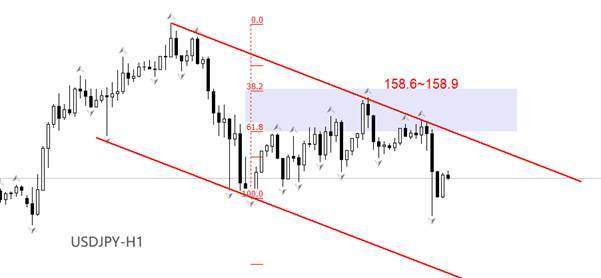 行情方面,小时周期,USDJPY处于短期回调态势。今日盘中(截至欧盘初)触及低点157.95点,有获得支撑迹象,下影线偏长。不过,市价距离通道线下轨仍有一段距离,仍存下跌可能性。考虑到前一轮反弹波段已经达到黄金分割区间158.6~158.9内部,所以本轮下跌走势触及通道下轨的概率相比获得支撑反弹的概率更高。