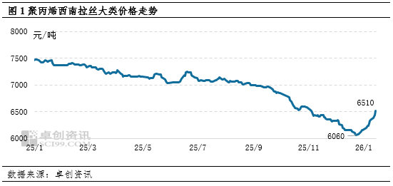 1月上旬受南美某国、中东某国等地缘局势影响,市场情绪好转,原油、丙烷、甲醇等原料价格重心整体上移,成本支撑下,1月9日PP重心涨至6360元/吨。随后煤炭上涨,进一步支撑能源价格。特朗普1月12日在社交媒体发文称,将对中东某国进行制裁并对其贸易伙伴征收额外关税,或影响该国能源外运,宏观消息面继续提振中旬市场心态,PP重心延续涨势。截至1月14日,西南市场PP拉丝大类均价涨至6510元/吨,环比1月初上涨310元/吨。