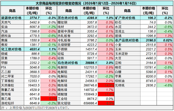 据中国物流与采购联合会对全国50种重要大宗商品市场价格调查显示,本期价格(2026年1月12日至2026年1月16日)与上期价格相比,31种(占比62%)大宗商品价格上涨,13种(占比26%)价格下跌,6种(占比12%)价格持平。