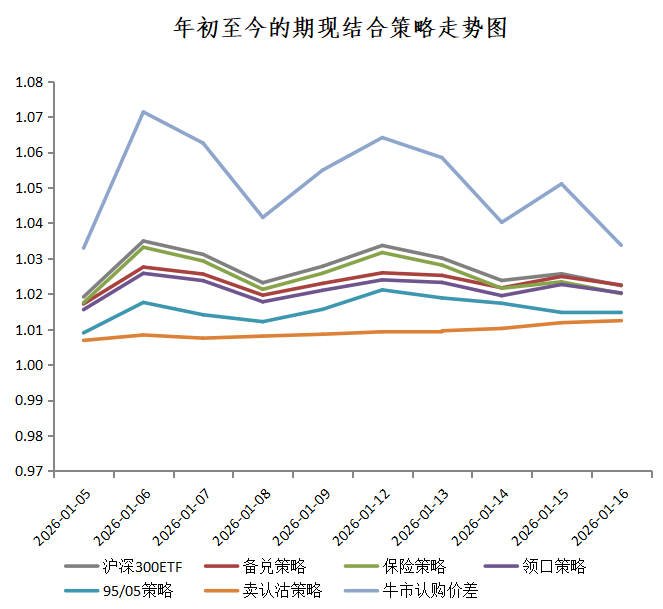我们对期现结合的六个策略(备兑、保险、领口、95/05配置、卖认沽、牛市认购价差)及沪深300ETF现货,在上周(2026.1.12-2026.1.16)的表现进行了回测。上周沪深300ETF微跌,卖认沽策略表现较好。具体结果如下: