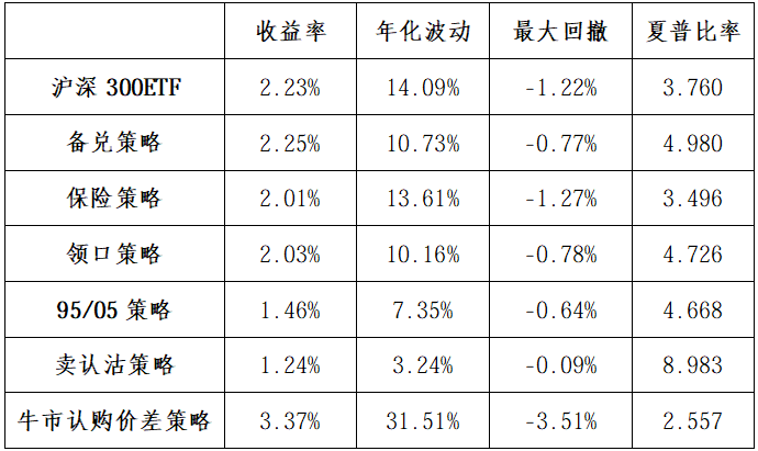 备兑、保险、领口策略建仓及调仓方法:组合基日为2025年12月31日,以收盘价买入1万份300ETF现货,备兑策略以收盘价备兑卖出开仓1张当月虚值5%的认购合约,保险策略以收盘价买入开仓1张当月虚值5%的认沽合约,领口策略以收盘价买入开仓1张当月虚值5%的认沽合约并备兑卖出开仓1张当月虚值5%的认购合约。此后在每个月期权合约到期日前一周的最后一个交易日进行调仓,以收盘价平仓已持有的期权合约,并以收盘价建仓相应的下月合约。当保险策略和领口策略所持期权收益率超过50%时,期权进行止盈平仓。