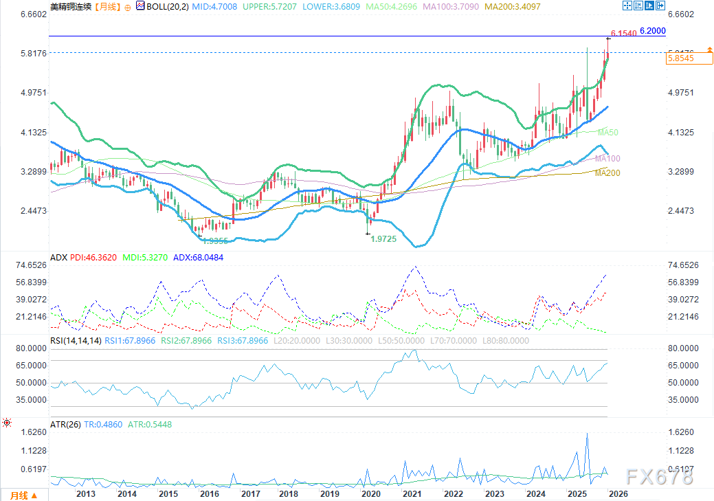 截至2026年1月,铜价目前交投于约5.83–5.85美元/磅,在月线图上再创历史新高。价格结构呈现出清晰的长期上升趋势,高点和低点均不断抬高。