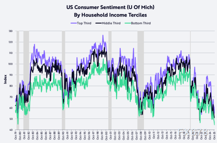 与此同时,中低收入群体消费者信心指数跌至80年代初以来的冰点,高收入群体信心也在近几个月出现趋势性回落。