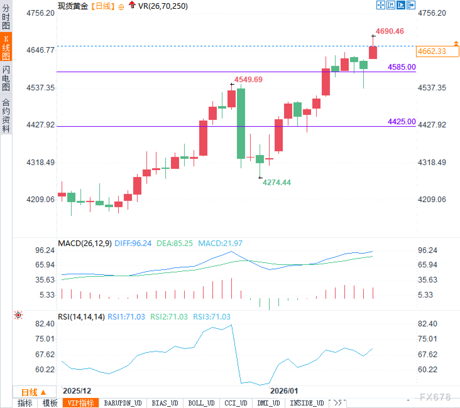 下方支撑区域需重点关注两个位置:一是4585.00美元,二是4425.00美元。这两个价位在过去曾多次发挥支撑作用,若回调过程中能在此区间企稳,大概率仍会被视为强势整理而非趋势反转;但若跌破且伴随放量下行,则需警惕短期走势由强转弱的可能性,市场或将进入重新定价阶段。指标方面,日线级别的MACD仍处于相对强势区,显示上升动能尚未衰竭;而RSI读数已达71.03,进入偏热区间,提示短线追涨风险正在上升。