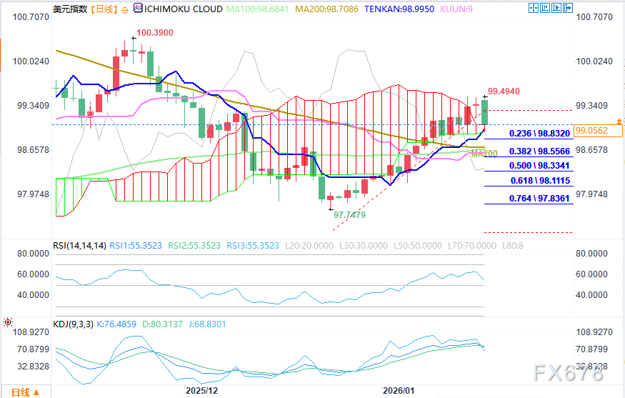 日线图上,看涨动能持续衰减,相对强弱指数(RSI)与随机指标KDJ双双走低;此前随机指标出现顶背离形态,标志着本轮反弹陷入停滞,多重信号仍指向美元中长期承压。此外,汇率曾在99.20美元斐波那契阻力位形成双重多头陷阱,当前汇率回升至99.04美元,暂稳于99.00美元支撑位上方,但短期仍受压制,若要彻底扭转偏弱格局,需突破上方阻力位;反之,若再度跌破99.00美元支撑,后续仍有下探98.83-98.73美元关键支撑区间的可能——该区间对应97.39-99.27美元上涨波段的23.6%斐波那契支撑位、日线转换线及云图底部,下方进一步支撑依次为38.2%、50%和61.8%斐波那契档位,对应价格分别为98.55美元、98.33美元和98.11美元。