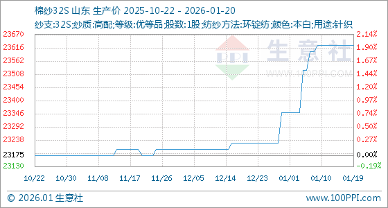 1月20日,生意社棉纱32S基准价为23625.00元/吨,与本月初(23350.00元/吨)相比,上涨了1.18%。
